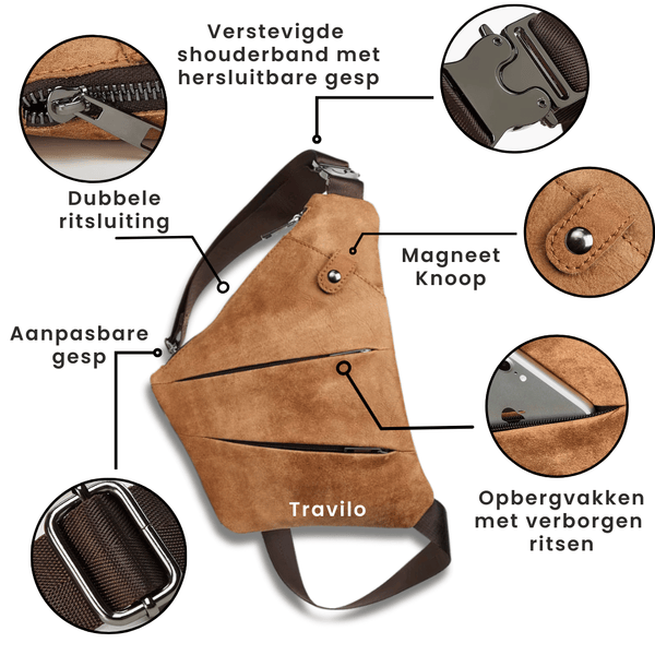 Zeg vaarwel tegen diefstalstress en rommelige tassen. Kies voor ultiem gemak en stijl tijdens je reizen met de Travilo™ Crossbody Reistas.